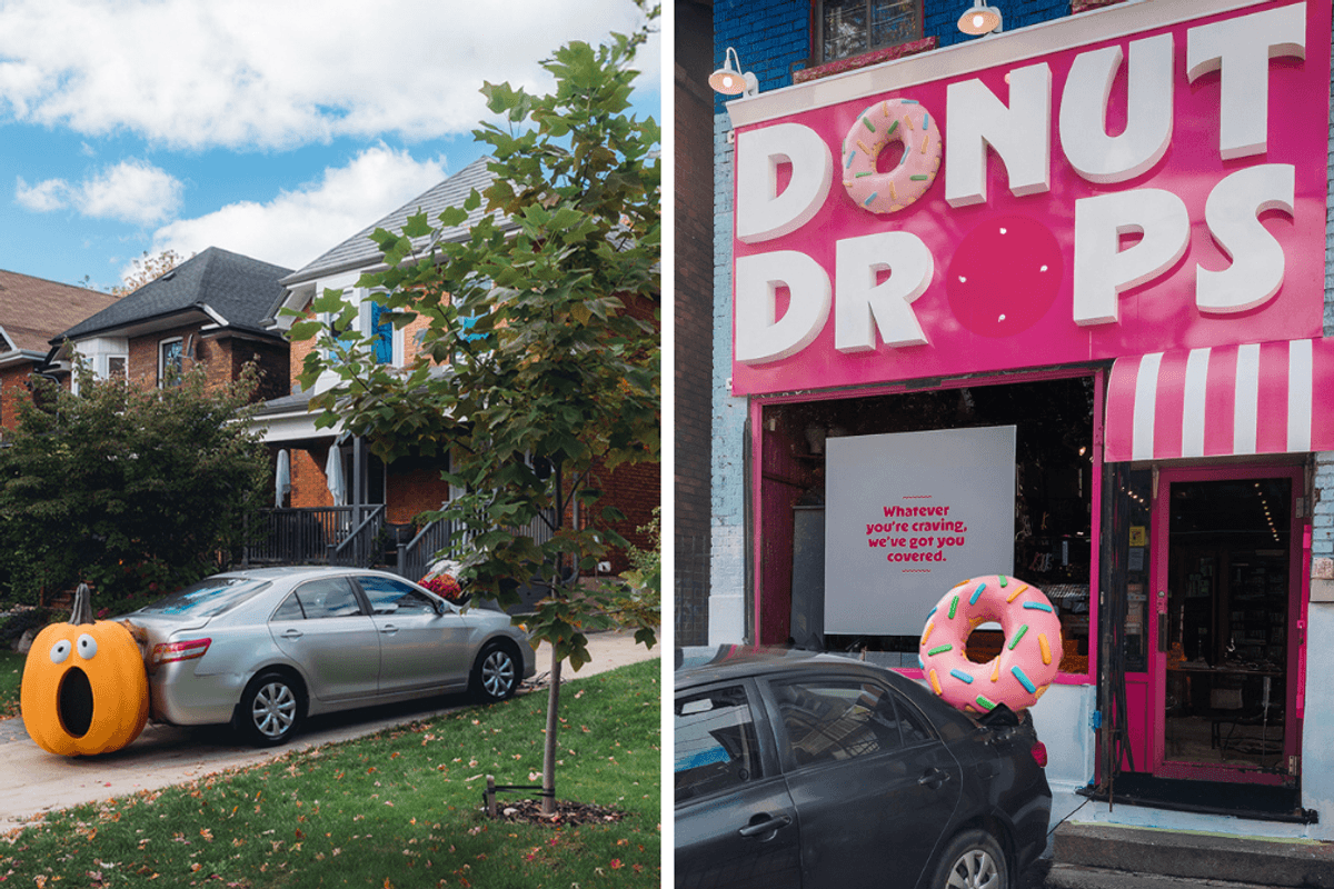 Something unusual has been happening to cars on the streets of Toronto this week: a car crushed by a giant donut, a shopping cart pileup, and a giant jack-o'-lantern causing a spooky scene in front of a High Park home.